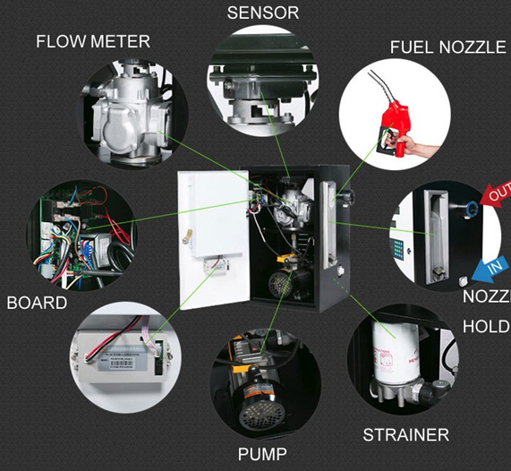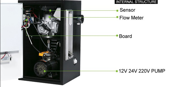 Hệ thống gồm: 1. Bơm: self priming vane pump 2. Lường: High accuracy Tatsuno Piston Flow Meter, +/-0.3% 3. Motor: 1 motor 550W, điện 12v, 24v, 220v 4. Bộ hiển thị SCB-06: Litre: 0-9999.99 Sale: 0-9999.99 Price: 0-999.99 5. Máng cò 6. 2m 1" Ống hút 7. 6m 3/4" Ống xuất 8. Súng bơm tự động 9. Máy in (tùy chọn) |