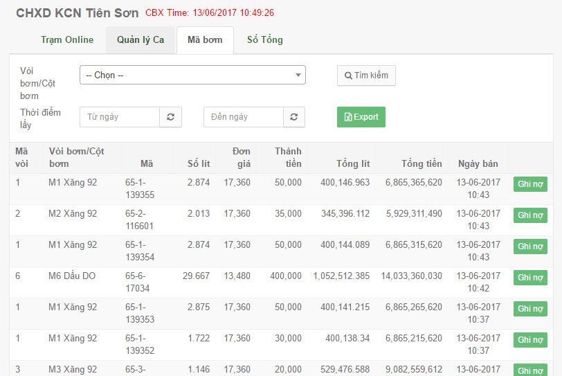 - Liệt kê, kết xuất mã bơm cho từng ca hoặc khoảng thời gian.
