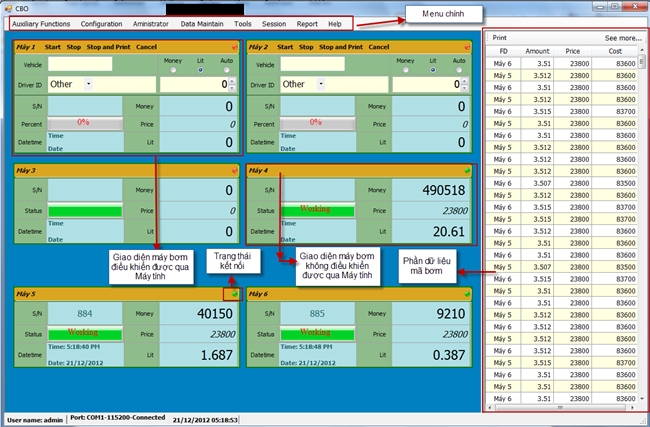 - Các số liệu mã bơm, tổng tiền, tổng lít được cập nhật với thời gian thực